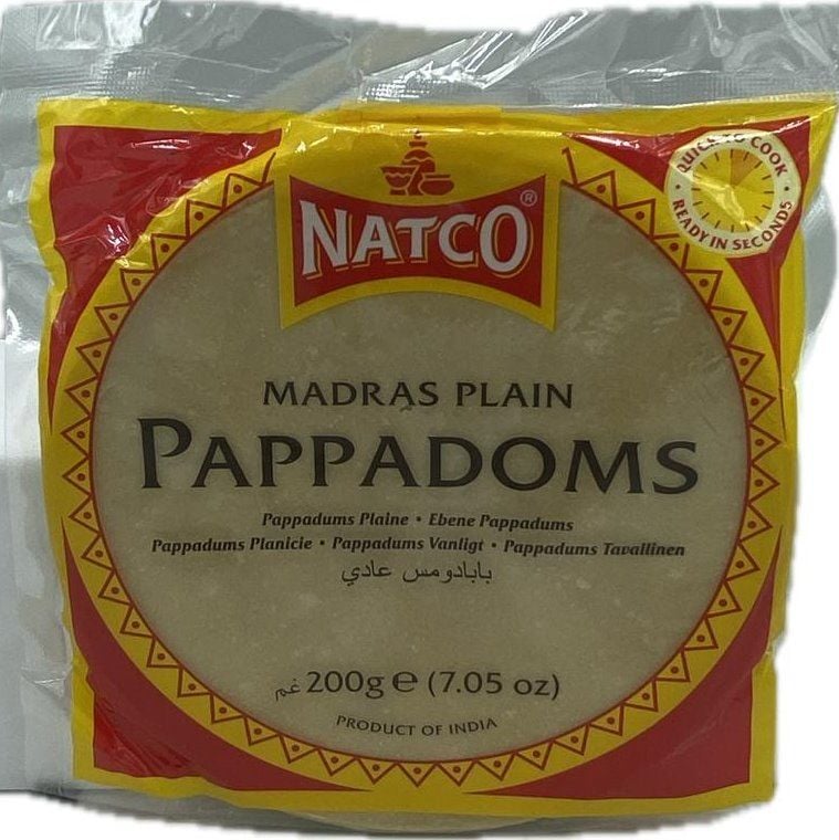 Natco, Pappadoms, Pappadum Mercimek Unu Ekmeği, 200 Gr. İçeriği: %90 Siyah Mercimek Unu, Pirinç Unu, Tuz, Kabartıcı: Kalsiyum Karbonat, Hindistan Cevizi Yağı. Menşei: Hindistan.